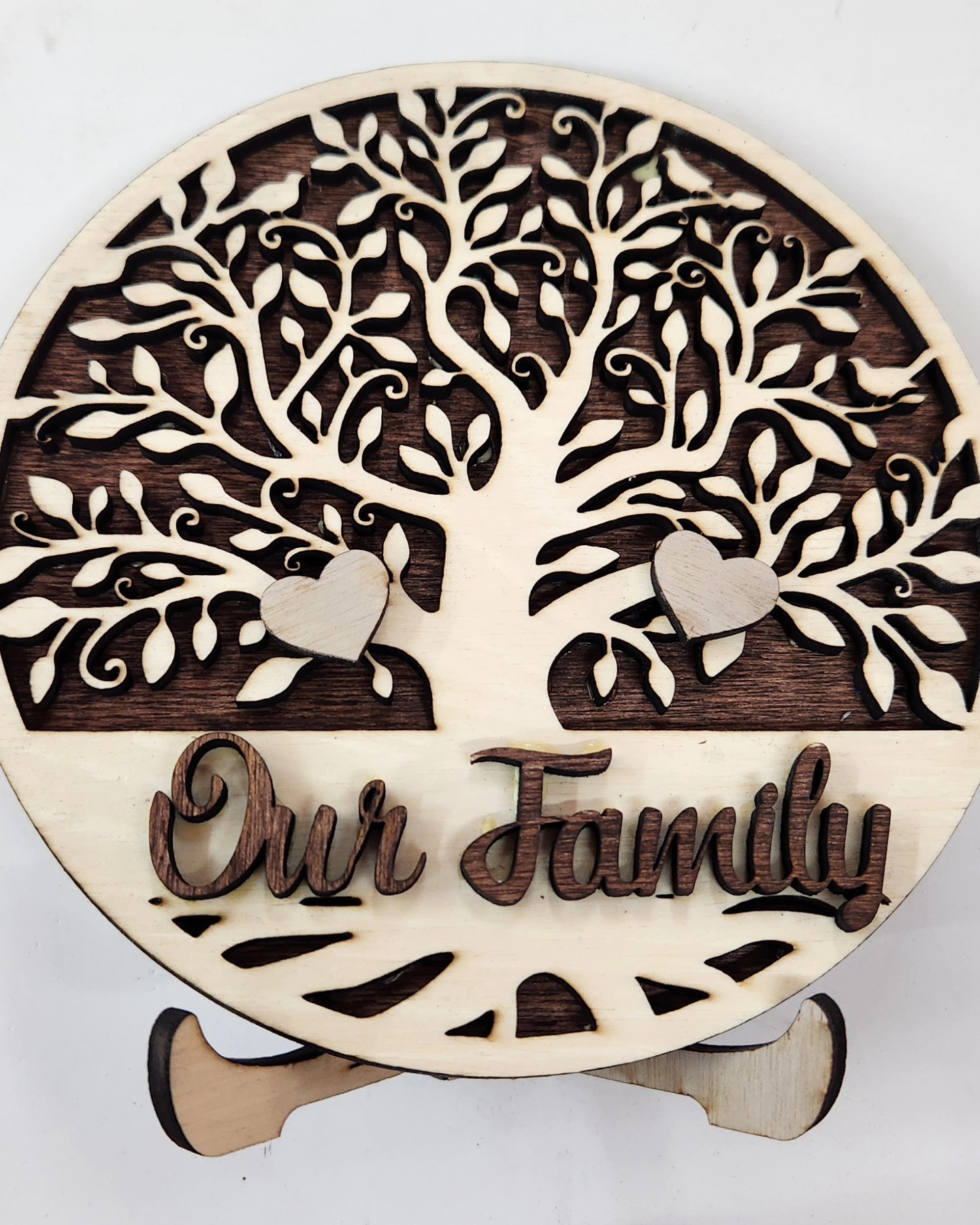 Enhance your home decor with our laser engraved and cut wood family tree decoration. Personalized with your family names, this beautiful piece comes with a decorative stand for easy display. Customize your space and showcase your family tree with this unique and meaningful addition. Display your heritage with pride!
